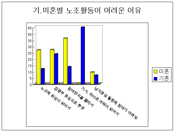 ¿©¼º³ëµ¿ÀÚÁß ±âÈ¥ºñÁßÀÌ ³ôÀ¸³ª ½ÇÁ¦ ¿©¼ºÁ¶ÇÕ¿ø³» ±âÈ¥ºñÁßÀÌ ³·Àº ¿¬¸ÍÀÇ °æ¿ìµéÀÇ °æ¿ì´Â ¹ÌÈ¥ÀÇ Á¶Á÷ÅðÁ÷ °æÇâ°ú ½Å±ÔÀÔÁ÷ÇÑ ±âÈ¥¿©¼ºÀÇ Àå±â±Ù¼Ó °æÇâÀ» º¸¿©ÁÖ°í ÀÖ´Ù.